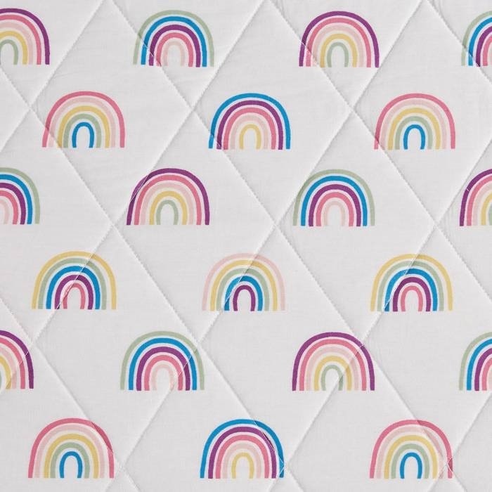 This Twin Size 2 Piece Pink Rainbows Reversible Cotton Quilt Set adds a bright, playful accent to any bedroom with its colorful two-tone pink/white stripe pattern on one side and a bold print on the reverse. It includes a quilt with a noticeable diamond weave along with two coordinating shams (one for the twin coverlet option). Each item is made from a breathable cotton fabric that arrives pre-shrunk and is good for all seasons. This set is non-pilling, so it stands up to frequent use and multiple trips through the washing machine.